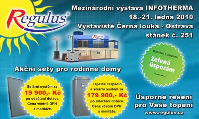 Společnost Regulus Vás zve k návštěvě svého stánku č. 251 na výstavě INFOTHERMA Ostrava ve dnech 18. - 21.1. 2010, kde představí např. solární systémy, tepelná čerpadla, rekuperační systémy, AKČNÍ SESTAVY DOTOVANÉ PROGRAMEM ZELENÁ ÚSPORÁM ...