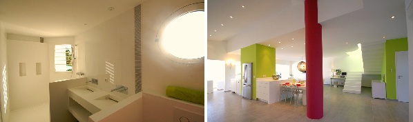 Koupelna z DuPont™ Corian® a obývací pokoj a kuchyň z DuPont™ Corian®