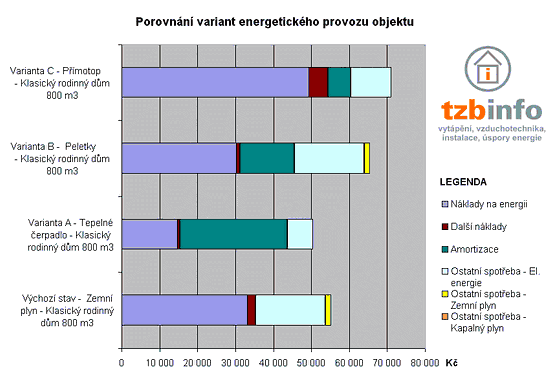 Pro druhou ukázku byly zadány parametry nízkoenergetického domu, který je v současné době ve stádiu dokončené hrubé stavby. Výpočtová tepelná ztráta domu je 4,5 kW, vytápěná plocha 116 m2, celkový objem 520 m3. Ve všech variantách byly investiční náklady zvýšeny o cca 80 000,- Kč na rekuperační výměník větracího vzduchu. Při použití tohoto výměníku je předpokládána roční spotřeba energie na vytápění 30 kWh/m2.a.