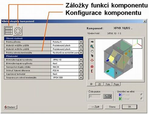 Podle složitosti komponentu a rozsahu jeho konfigurace bývají údaje i na několika záložkách, které se aktivují tlačítkem se symbolem funkce. Je důležité zejména u prvního komponentu v zařízení strávně definovat první záložku vlastností. Všechny ostatní komponenty totiž od předchozího přebírají (dědí) mnoho vlastností (např. materiálové provedení, servisní stranu, stranu připojení medií)...