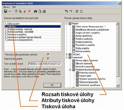 Uživatel má možnost vytvářet vlastní šablony tiskových úloh a definovat jejich rozsah. Jedna z úloh se nabízí jako výchozí, avšak před tiskem si lze zvolit kteroukoli z předdefinovaných. Tiskové úlohy lze kdykoli doplňovat nebo jakkoli měnit.
