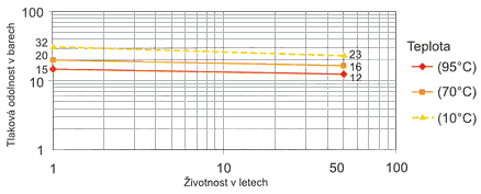 Životnost potrubí Alpex v závislosti na tlaku při dané teplotě provozu
