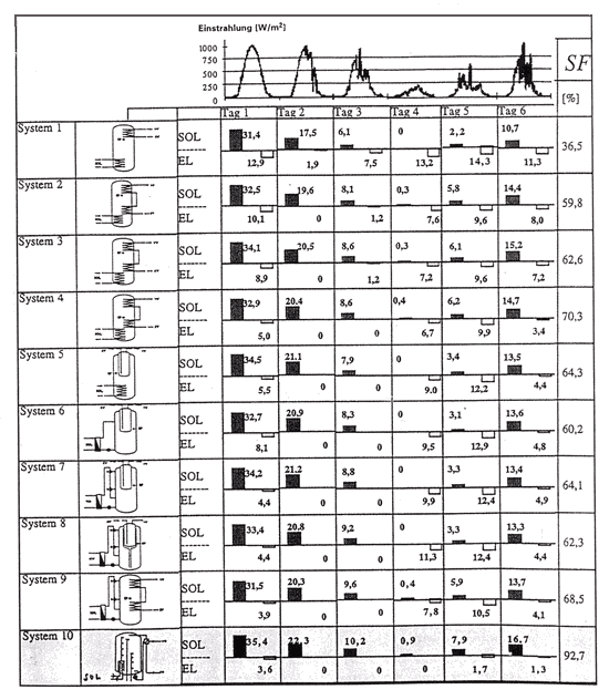 Zajímavé posouzení zásobníků bylo provedeno ve středisku Solar Energy Research Centra ve Švédsku (SERC). Do každého zásobníku byla přiváděna energie z 10 m2 kolektorů stejné výroby (označení SOL). Dohřívání na požadovanou teplotu el. energií je označeno EL. Solární pokrytí z celkové potřeby energie je označeno SF a udává % podíl solární energie tab. č. 2.