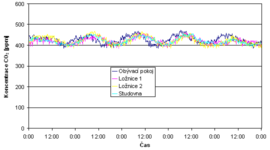 Protože demonstrační dům není zatím trvale obydlen, je koncentrace CO2 uvnitř domu po většinu času stejná jako koncentrace CO2 ve venkovním vzduchu. Na obr. 11 je koncentrace uvnitř jednotlivých místností v průběhu pěti dnů.