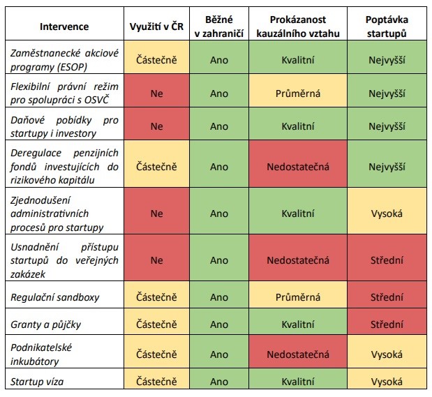 Přehled všech zvažovaných intervencí je uveden v Tabulce 1. Tabulka obsahuje informace o jejich využití v ČR a v zahraničí, dostupné vědecké evidenci a poptávce ze strany startupů dle hodnocení České startupové asociace. Data v této tabulce identifikují intervence, které mohou mít pozitivní dopad. V této fázi však na jejich základě ještě nelze doporučit žádná konkrétní opatření k realizaci, jelikož se tato studie zatím nezabývá jejich nákladovou efektivností nebo riziky. Posouzení těchto aspektů bude nezbytnou součástí navazující komplexní dopadové analýzy (tzv. hodnocení RIA).