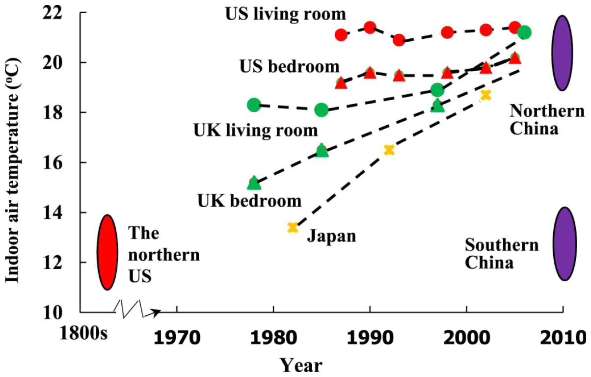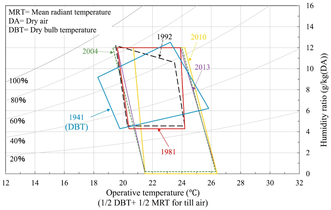 „Comfort chart“ je psychrometrický graf, který se již dlouho používá k vizualizaci „komfortní zóny“ – oblast kombinací operativní teploty a vlhkosti, doporučených jako návrhové podmínky pro pobyt lidí. Obr. 1 ukazuje historii ASHRAE (American Society of Heating, Refrigerating and Air Conditioning Engineers) zimní komfortní zóny během sedmdesáti let. Zde je zřejmá dlouhodobá nejistota v chápání tepelného komfortu člověka. Z obr. 1 je však patrný dlouhodobý trend posunu zón zimního komfortu k postupně teplejším podmínkám během posledních sedmi desetiletí (1941 až 2010). Obr. 2 ukazuje historické trendy zimních vnitřních obytných teplot ve Velké Británii, USA, Japonsku a Číně. Obrázek naznačuje, že „propast v komfortu“ se v průběhu času zmenšuje a konverguje k nějaké neutrální zimní obytné teplotě kolem 21 °C kolem roku 2010. Někteří výzkumníci tento trend dokonce pojmenovali jako „homogenizace vnitřního prostředí“. [5]