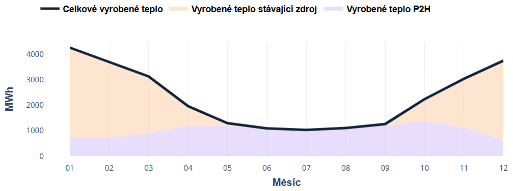 Obrázek 3 znázorňuje sezónní rozdělení výroby tepla v soustavě centrálního zásobování teplem s rozlišením příspěvku stávajícího zdroje a jednotky přeměny elektřiny na teplo. Výroba tepla ze stávajícího zdroje sleduje typický průběh s vysokou produkcí v zimním období a omezeným provozem v letních měsících, což je dáno nižší poptávkou po teple pro vytápění budov. Tepelné čerpadlo je dimenzováno pro provoz mimo topnou sezónu jako sekundární zdroj a přispívá především v obdobích, kdy jsou provozní teploty příznivější a kdy tržní podmínky související s výrobou z obnovitelných zdrojů umožňují nákladově efektivní provoz. Černá křivka znázorňuje celkové množství tepla dodaného z obou zdrojů, které dosahuje maxima v zimním období a minima v létě, což odráží základní sezónní charakter tepelné poptávky.