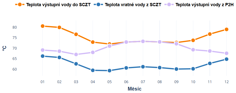 Průměrná výstupní a vratná teplota vody do SCZT (topná sezóna) [°C]90 / 7070 / 5090 / 7090 / 70