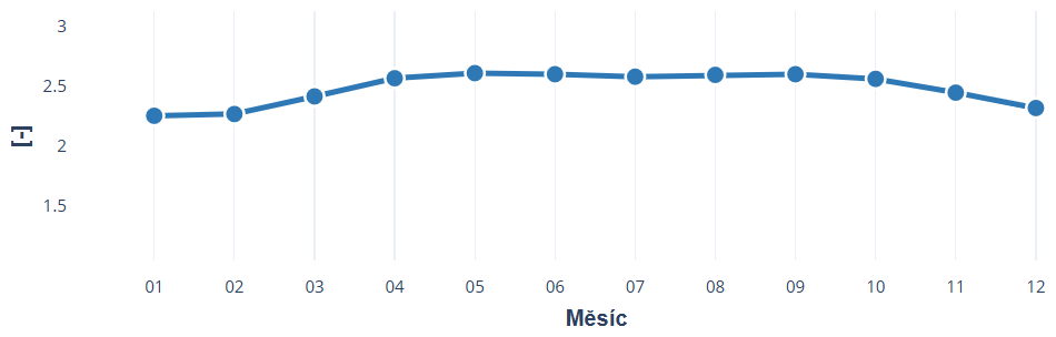 Obr. 5 Průměrné COP simulovaného tepelného čerpadla v průběhu roku (ukázka vizualizace v nástroji https://elektrifikaceteplarenstvi.cz/)