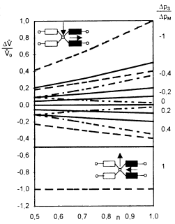 Různé propustnosti mohou být spojeny také s různými exponenty tlaku (srov. rovnici (3a)). Z toho vyplývající vliv na velikost chyby měření je na obr. 4 znázorněn pro poměr propustnosti G1/G2 = 1 a pro poměru tlaku ΔpS/ΔpM = 0,4 (podtlak), resp. ΔpS/ΔpM = -0,4 (přetlak). Přitom je dán buď n1 = 0,5 nebo n2 = 0,5 a druhý exponent jako proměnný. Základem zobrazených hodnot je vztah