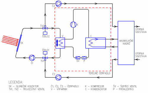 1 kombinovaný systém, kde solární systém je využíván pro zvyšování teploty média na vstupu tepelného čerpadla