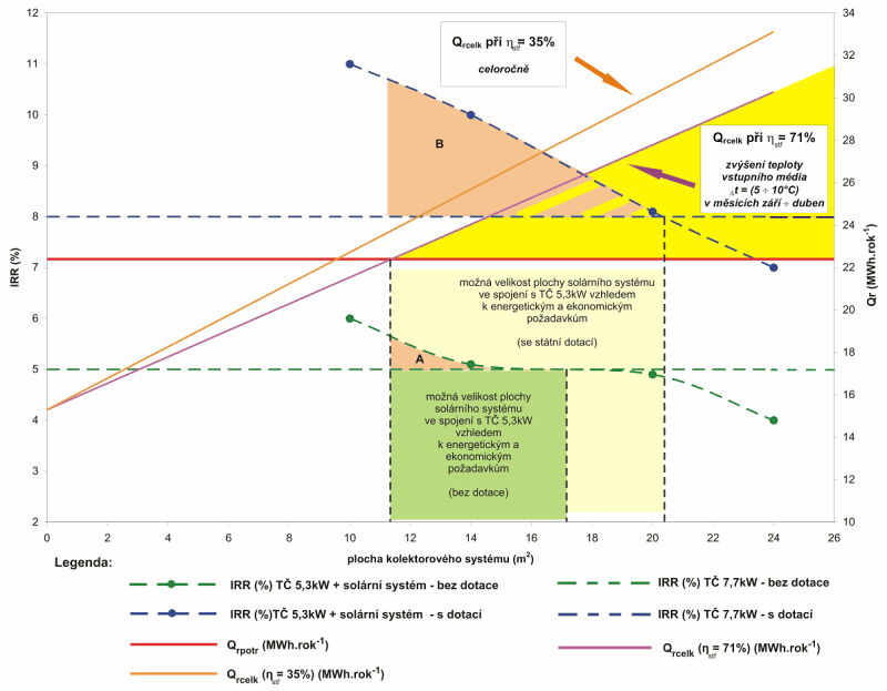 - z hlediska ekonomických požadavků je kombinovaný systém porovnáván se systémem v němž je jako zdroj použito samostatně pracující tepelné čerpadlo. Zelené křivky v grafu představují vnitřní výnosovou míru (IRR) obou porovnávaných projektů, a to bez možnosti poskytnutí státní dotace na realizaci projektu. Naopak křivky modré barvy prezentují stejnou skutečnost, ale s tím rozdílem, že do financování je započítána i možná maximální výše státní dotace. Plochy označené jako "A" a "B" prezentují v grafech oblast, ve které je projekt kombinovaného systému z hlediska vnitřní výnosové míry a peněžních toků výhodnější než původní projekt s tepelným čerpadlem.