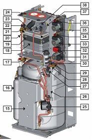 1) Kondenzační kotel (18) 2) Zásobník teplé vody () 3) Deskový výměník pro přípravu teplé vody (26) 4) Oběhová čerpadla pro 3 různé okruhy (31,33,35) 5) Speciální čerpadlo pro solární soustavu (30) 6) Zásobní nádrž solární soustavy (15) |