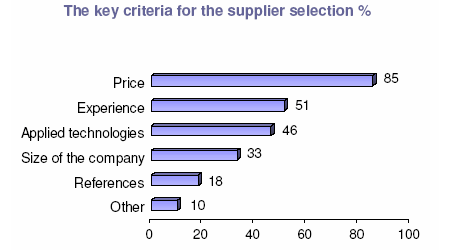 Při výběru dodavatele je pro ukrajinské stavitele nejdůležitějším kritériem cena (78 procent; 85 procent v roce 2007), s odstupem následují reference (59 procent; 18 procent v roce 2007), zkušenosti (54 procent; 51 procent v roce 2007), aplikované technologie (39 procent, 46 procent v roce 2007) a velikost společnosti potenciálního dodavatele (21 procent, 33 procent v roce 2007).