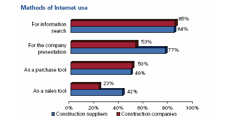 Internet využívá 95 procent dotázaných stavebních společností. Nejvíce je využíván pro hledání informací a prezentaci společnosti.
