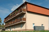 Jedná se o dům s pečovatelskou službou starších občanů. Otopný systém je tvořen velkoplošnými radiátory. V systému vytápění je použito tepelné čerpadlo MACH vzduch/voda o výkonu 40kW doplněné pomocným zdrojem plynovým kotlem. Je zde využito velmi zajímavé řešení, kdy mimo topné období je ohřev teplé užitkové vody zajišťován tepelným čerpadlem MACH voda/voda, kde primárním zdrojem je samotný otopný systém. Tímto řešením dochází k samotnému využití energetického potenciálu (tepla z lidí, svícení, vaření, atd.). Tepelné čerpadlo MACH pro přípravu teplé vody mimo topné období typu voda/voda má výkon 15kW.