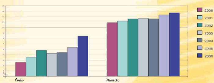 Obr. 2: Nárůst cen plynu od roku 2000 až do roku 2006. Srovnání růstu v České republice a v Německu - Euro za kWh