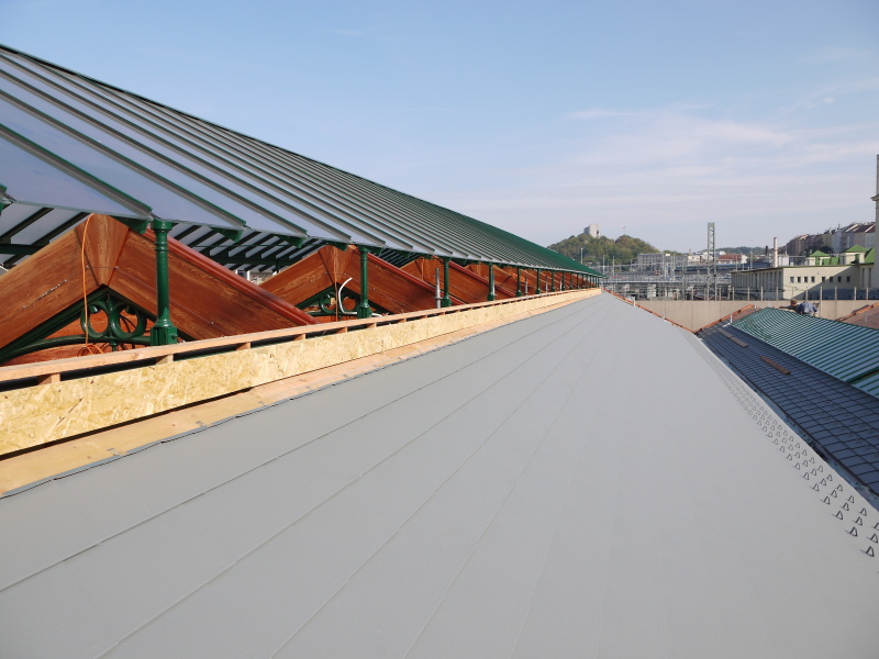 Montážní práce na opravě střešního pláště odjezdové haly na Masarykova nádraží provádí firma A-Z Bau s.r.o., která se specializuje na rekonstrukce střech a vnějších plášťů budov. Společnost A-Z Bau s.r.o. je autorizovanou montážní firmou, spolupracuje s předními dodavateli střešních výrobků, jako jsou Meindl, Tondach, Bramac, Beta, Ikopal, PREFA a střešních oken Velux a Roto.