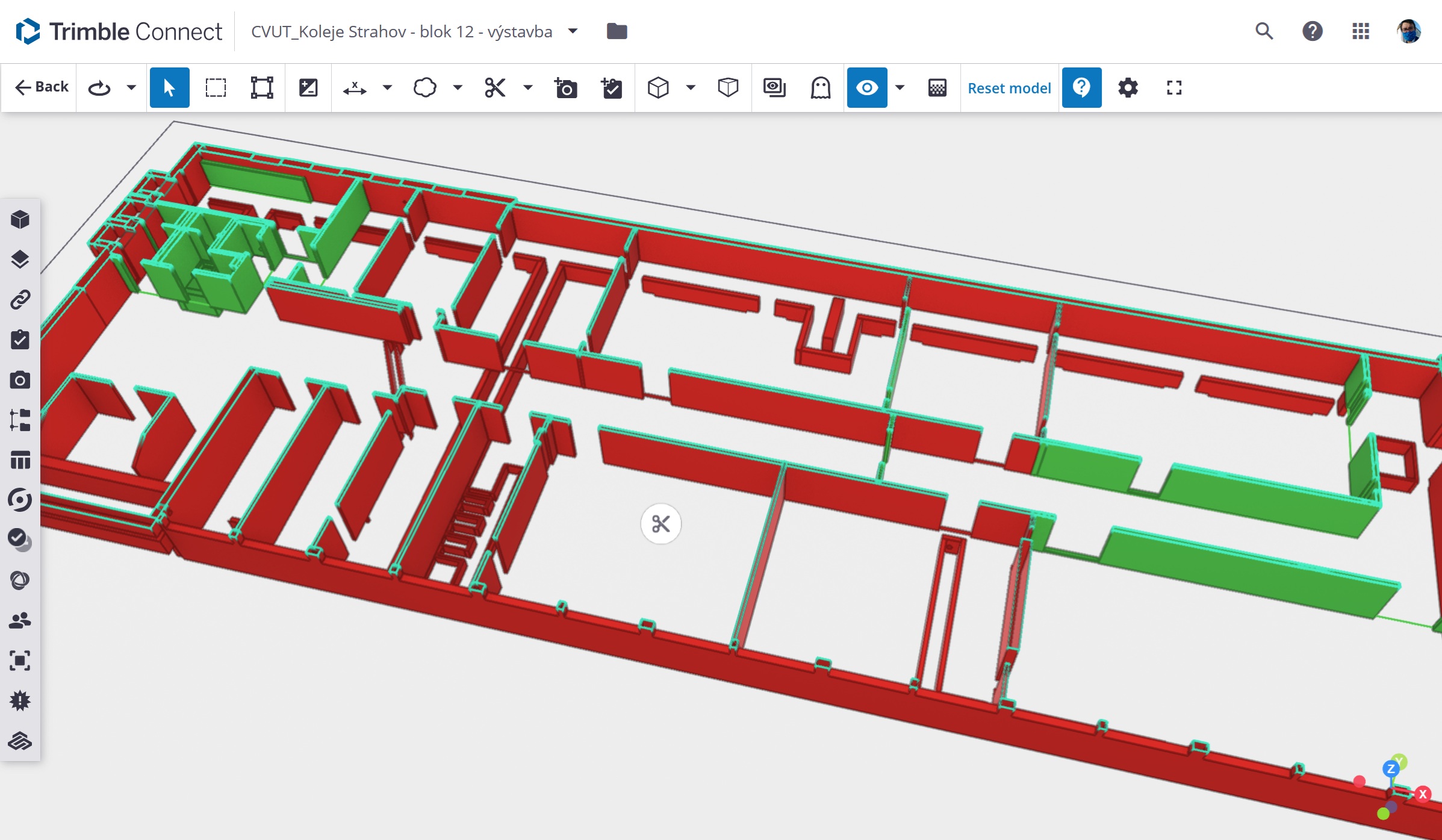 V současné době je projekt přerušen z důvodu zjištění odhalených výztuží na nosných konstrukcích. Únosnost stropů je tím oslabena a projekt musí být přepracován. I v takto obtížné situaci se ukazuje, jak BIM přístup ČVUT pomohl. Za normálních okolností by se projekt přepracovával minimálně půl roku. V případě metody BIM šlo využít již hotového modelu, upravit ho podle skutečností zjištěných na stavbě a rychle navrhnout nové řešení. Doba, po kterou musí investor platit „přerušenou“ stavbu, se tak zkracuje na polovinu.