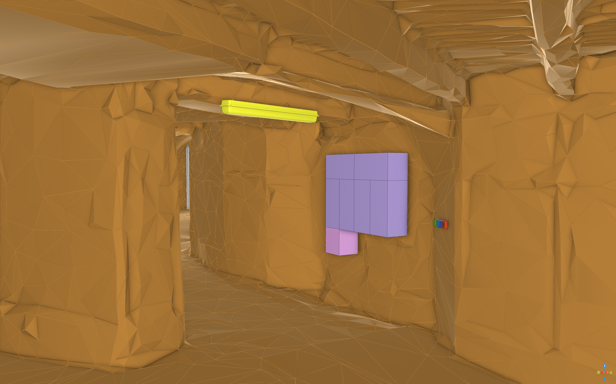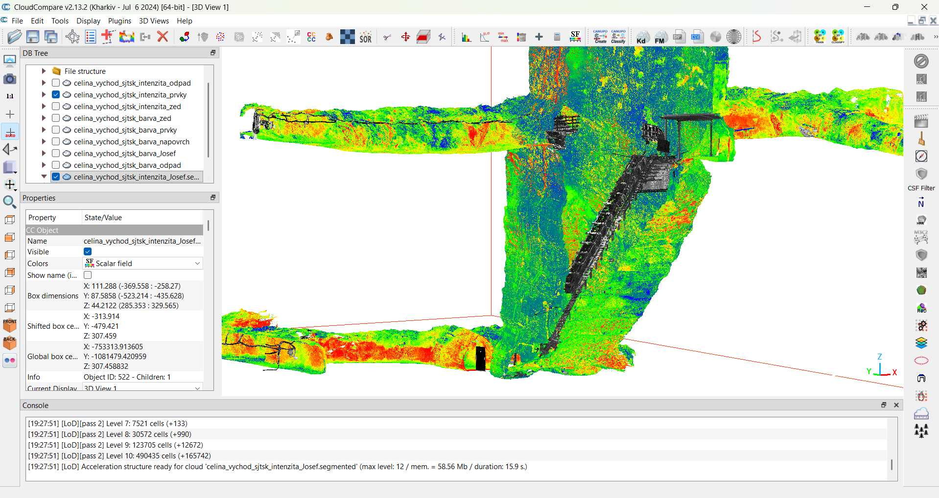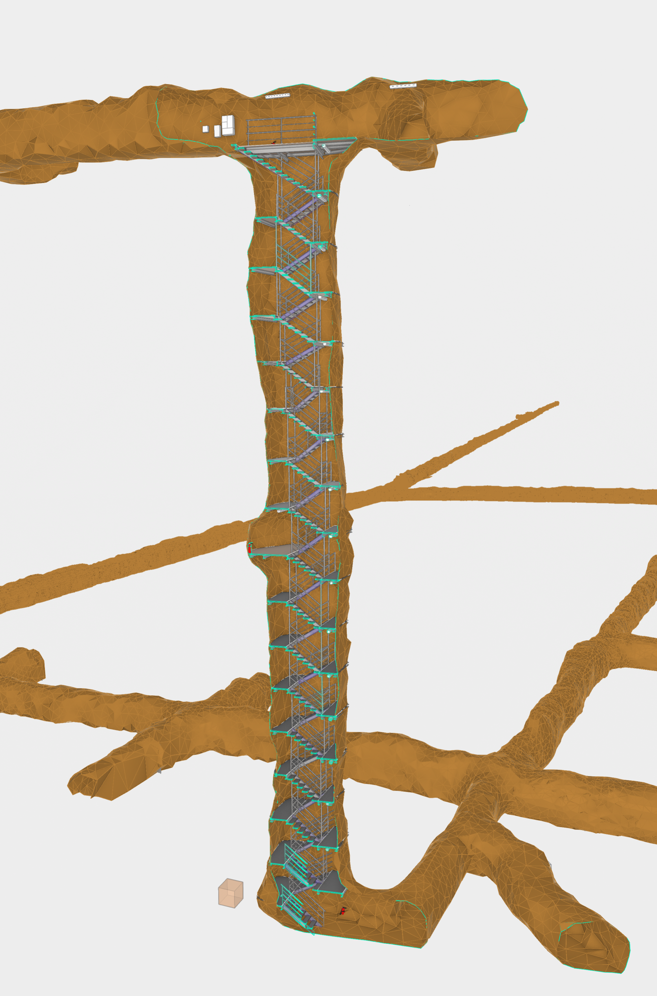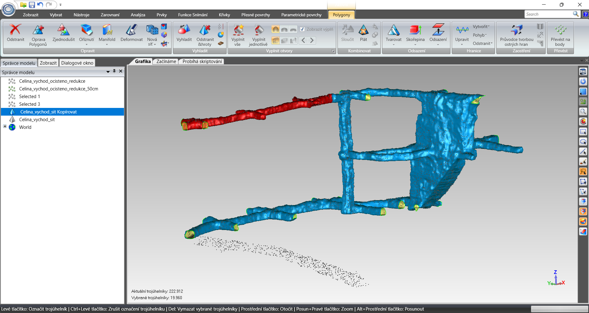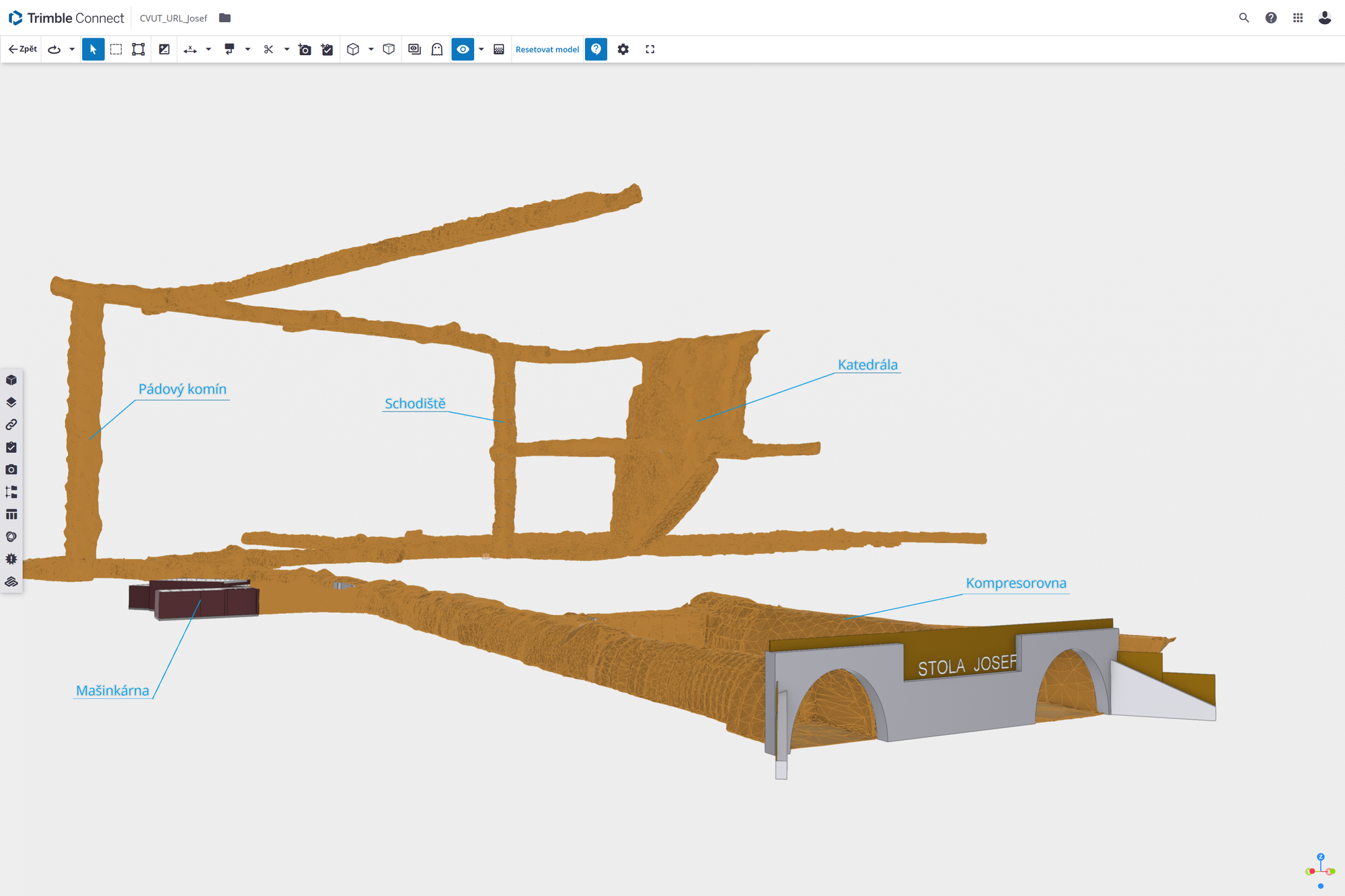 Prvky obvyklé pro klasické pozemní stavitelství byly modelovány nástrojem Revit – světla, vypínače, rozvodné skříně, přenosná hasicí zařízení, potrubní systémy, záporové stěny, nosníky, schodiště. Štoly, resp. rozrážky byly modelovány jako polygonální sítě ve třech různých úrovních detailu. K nim byla využita kombinace nástrojů – Cloud Compare (Obrázek 1 – CloudCompare), MeshLab, AutoCAD a Geomagic Wrap (Obrázek 2 – Geomagic wrap). Mračna bodů byla nejdříve vyčištěna, byla provedena kontrola jejich geolokace. Následně byly odebrány body modelovaných prvků (např. stavební konstrukce) tak, aby zůstala pouze plocha styku horniny a rozrážky/štoly. Odebrané body modelovaných prvků se později použili k jejich přesnému umístění.