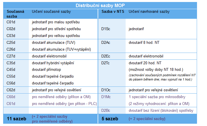Nový tarifní systém bude mít méně distribučních sazeb než stávající a zákazníci budou automaticky převedeni do nové sazby podle převodní tabulky. Zákazník si však může zvolit i jinou sazbu, k rozhodnutí by mu měl pomoci cenový kalkulátor. Upozorňujeme ale, že si lze zvolit jen sazbu, jejíž podmínky pro využívání budou splněny.