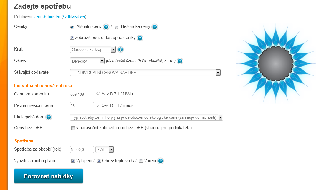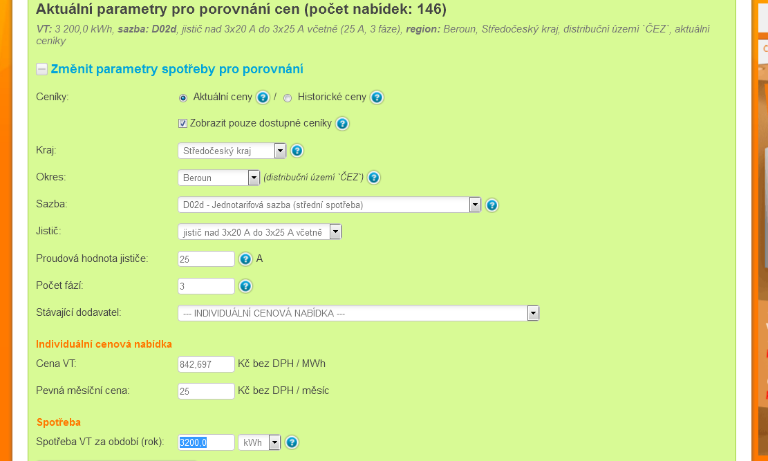 Cena za komoditu je závislá na tom, zda bude účtován měsíční stálý plat, když uvažujeme s konstantními úsporami. Při výpočtu lze vycházet z toho, že stálý měsíční plat bude jen minimální, tj. asi ve výši 25 Kč. Zveřejněné úspory dosažené aukcí dTestu se vztahují k cenám dominantních dodavatelů v jejich distribučních územích. Pro elektřinu to znamená produktovou řadu ČEZ Comfort (tarifní sazba D02d a roční spotřeba 3,2 MWh), pro plyn zase RWE Standard (roční spotřeba 15 MWh). Zájemci o cenu mohou v Kalkulátoru cen energií TZB-info funkci „Individuální cenová nabídka“, viz následující obrázky a cenu si snadno spočítat. V Praze a v distribuční oblasti společnosti E.ON se budou ceny lišit.