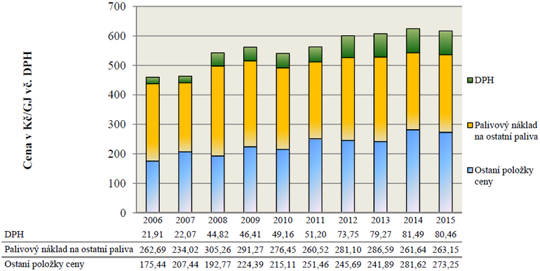 V následujících grafech č. 6 a č. 7 je za období let 2006 až 2015 uvedena skladba průměrné výsledné ceny tepelné energie pro konečné spotřebitele, ve které je patrný dopad DPH, palivových nákladů (vycházejí z přepočtu palivových nákladů na zdroji zohledněné o tepelné ztráty v rozvodném tepelném zařízení) a ostatních položek na cenu tepelné energie. Od roku 2008 se do palivových nákladů začala promítat ekologická daň. Jednotková výše nákladů v ceně tepelné energie je ovlivněna rovněž postupným poklesem dodávek tepelné energie, který za sledované období let 2006 až 2015 činil cca 24,1 %. Na cenu tepelné energie má vliv rovněž i inflace, která dle údajů Českého statistického úřadu v jednotlivých letech sledovaného období 2006 až 2015 byla 2,5 %, 2,8 %, 6,3 %, 1,0 %, 1,5 %, 1,9 %, 3,3 %, 1,4 %, 0,4 %, 0,3 % tzn. kumulovaně 23,4 %.