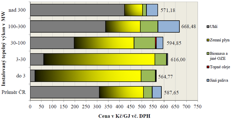 V grafu č. 10 jsou znázorněny průměrné ceny tepelné energie pro konečné spotřebitele za rok 2015 rozdělené v závislosti na instalovaném tepelném výkonu zdrojů tepelné energie. Výše instalovaného tepelného výkonu je rozdělena do pěti skupin a zároveň je zde zobrazen podíl paliv použitých při výrobě tepelné energie v jednotlivých skupinách. U větších zdrojů převládá podíl uhlí, se snižující výší instalovaného tepelného výkonu se zvyšuje podíl ostatního paliva (především zemního plynu).