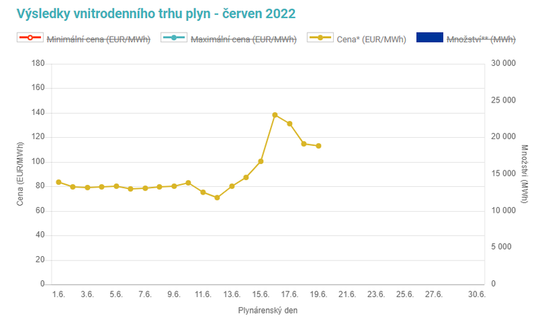 Na spotovém trhu Operátora trhu (OTE) byla cena elektřiny vyjádřená indexem (BASE LOAD) nejvýše v úterý, cena dosáhla 324,19 EUR/MWh, potom začala mírně klesat. Trhy velmi citlivě reagují na hlavně špatné zprávy, zejména v době nedostatku komodity, proto situace s cenami je poslední dobou velmi volatilní.