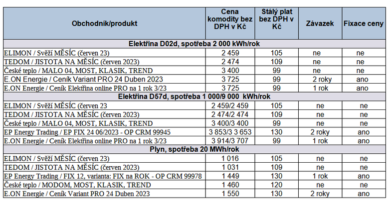 Přehled obsahuje vždy dva produkty s fixní cenou po dobu jednoho měsíce a s cenou, která se odvíjí podle měsíčních kontraktů na burze v Praze (PXE). Je to pro ty, kteří jsou připraveni vývoj cen na burze sledovat a případně nějakého nebezpečí ihned změnit produkt. Výpověď je jeden měsíc, tak to nebude problém. Tyto produkty po skončení zastropování cen přejdou na spotové ceny, takže zájemci by si mohli polepšit, protože příplatky k cenám bývají levnější.