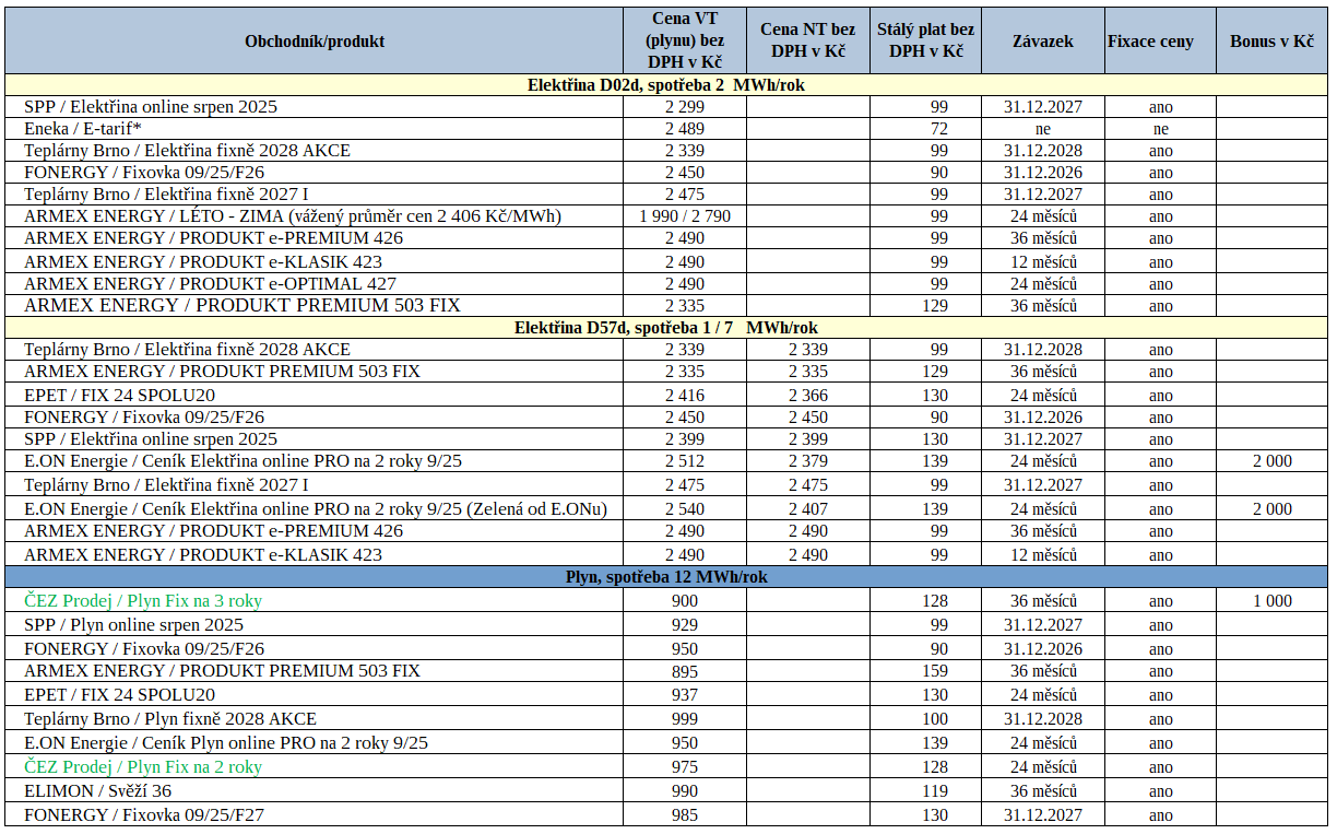 Tab. 2: Přehled nových ceníků za uplynulý týden (zeleně – nižší cena než u předchozího srovnatelného ceníku, červeně – vyšší cena, * – produkt v zimě s fixní cenou, v létě s měsíčním fixem, ** – měsíční fix)