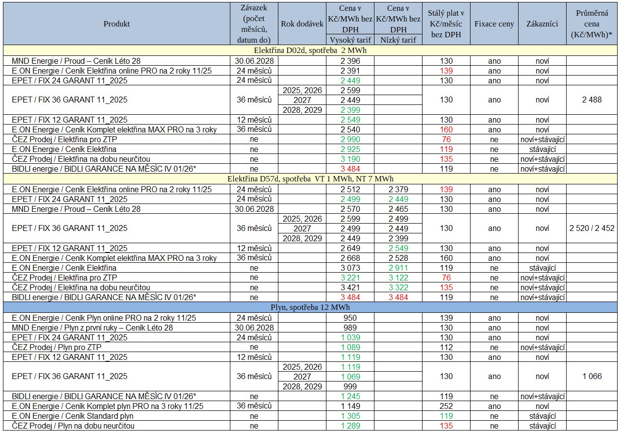Společnost ČEZ Prodej uplynulý týden zveřejnila nové ceníky pro stávající, většinou věrné zákazníky. Oproti letošku budou klienti dodavatele platit méně za silovou elektřinu i za plyn. Například ČEZ u nejobvyklejšího tarifu D02d sníží cenu elektřiny o 198 Kč/MWh a plyn při spotřebě 12 MWh, kterou uvádím v tabulkách, sníží cenu komodity o 57 Kč/MWh. Tím domácnost na elektřině při spotřebě 2 MWh ušetří zhruba 376 korun proti letošku a na plynu 726 Kč. Úsporu mírně snižuje vyšší stálý plat, který se takřka jednotně zvyšuje ze 128 na 135 Kč/měsíc. Tarifů pro stávající zákazníky mají hlavní dodavatelé mnoho, v současné době se obchodníci snaží sjednotit ceny pokud možno všech produktů, což je i u nových ceníků pro stávající zákazníky ČEZu. Obchodník neměnil akviziční ceníky pro nové zákazníky.