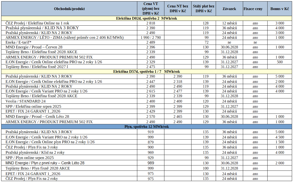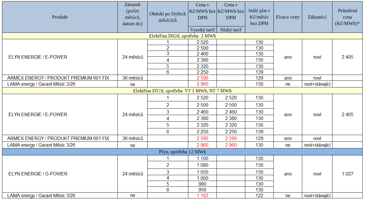 Dalším užitkem následující tabulky je rychlá orientace v cenách elektřiny nebo plynu za účelem sjednání lepší ceny u stávajících dodavatelů.