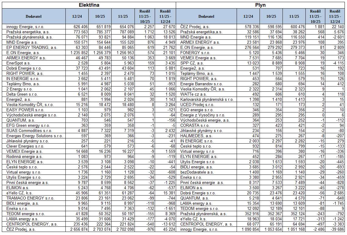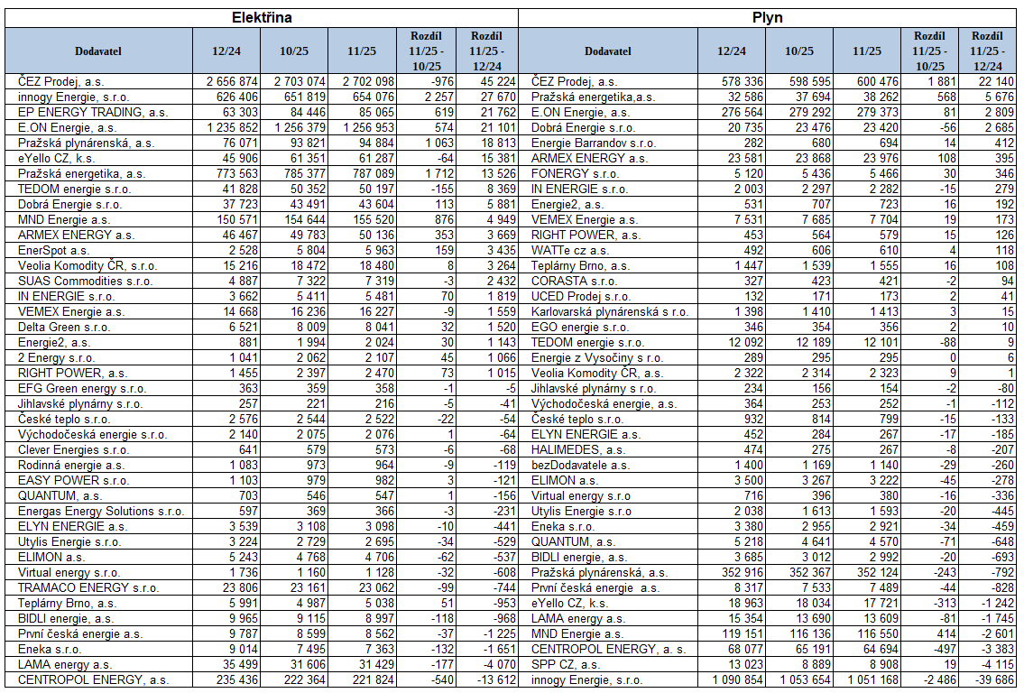 Který z dodavatelů elektřiny a plynu získal v roce 2025 nejvíce zákazníků?