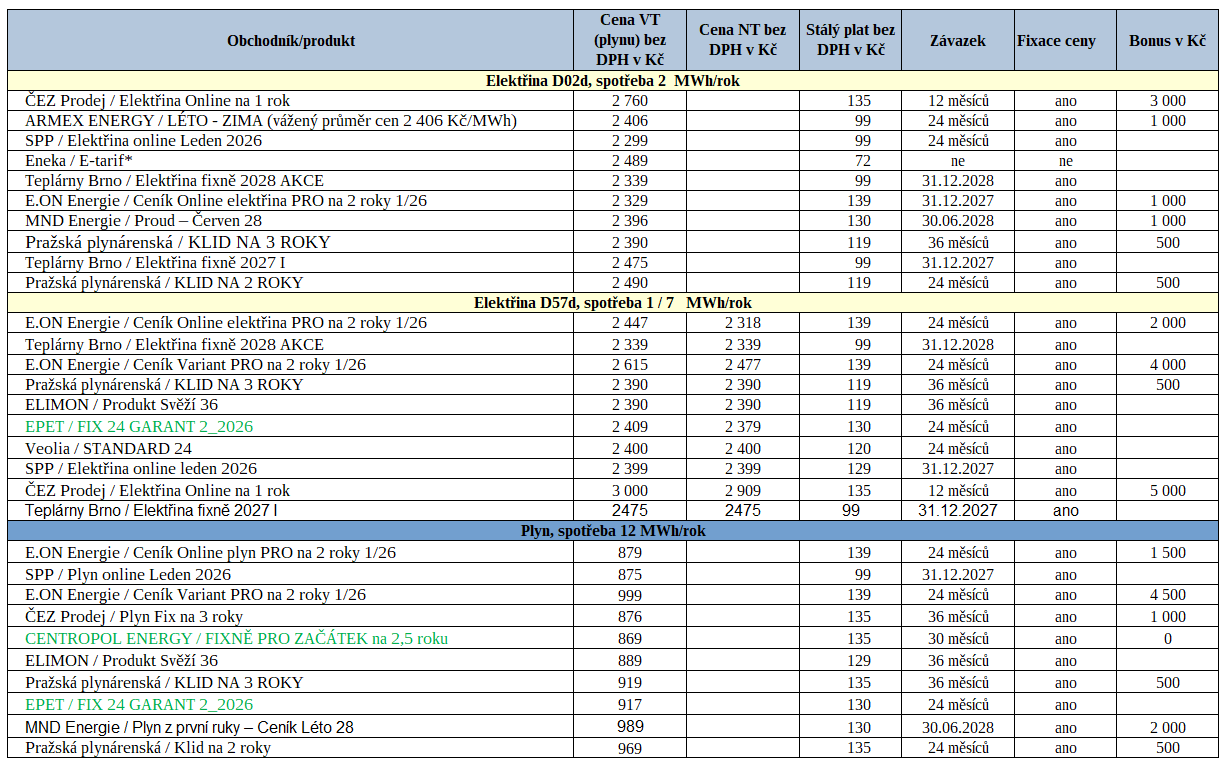 Tab. 2 Přehled nejvýhodnějších nabídek na trhu s elektřinou a s plynem za poslední týden (zeleně – novinky, * je pro zákazníky se spotřebou do 3 MWh/rok)