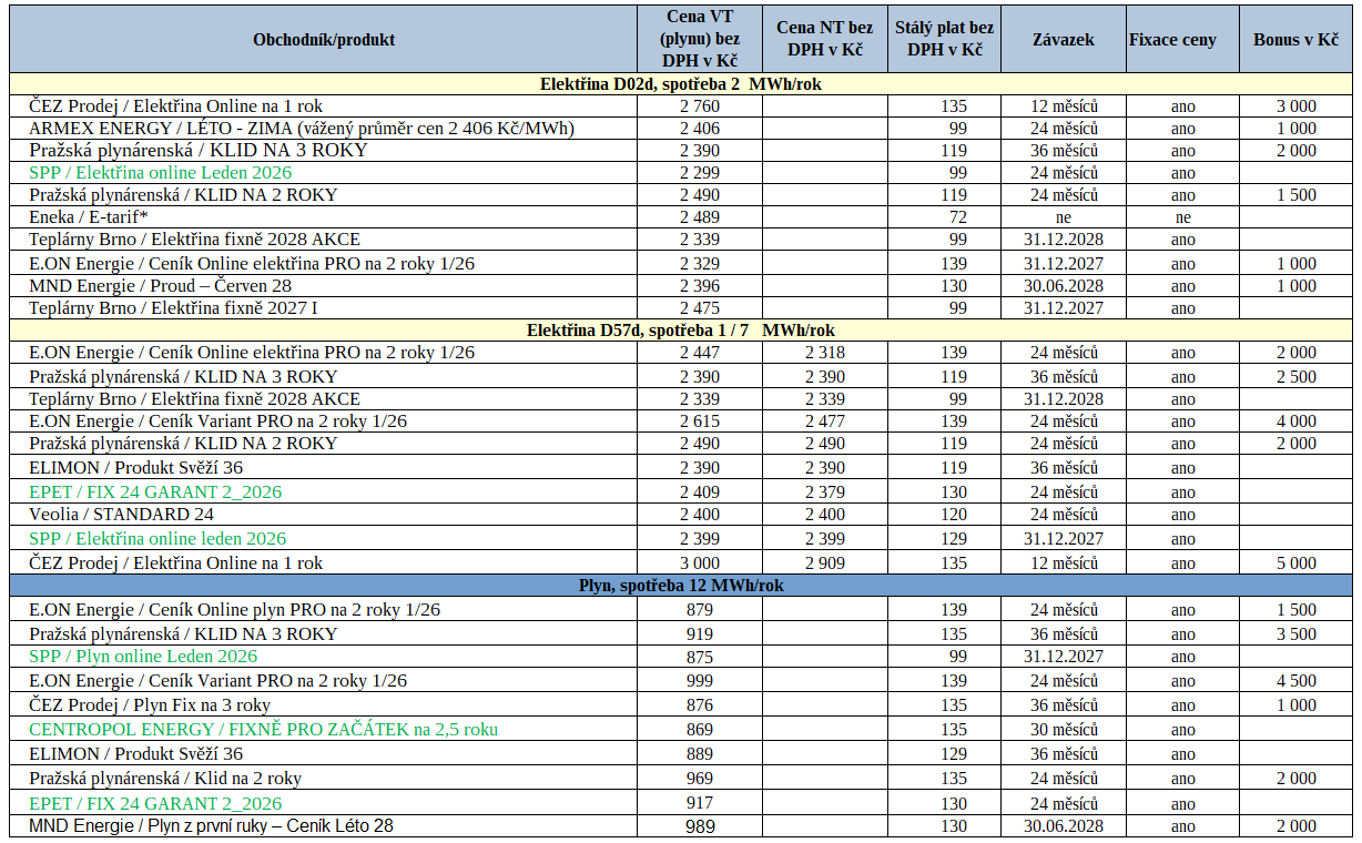 Tab. 2 Přehled nejvýhodnějších nabídek na trhu s elektřinou a s plynem za poslední týden (zeleně – novinky, * je pro zákazníky se spotřebou do 3 MWh/rok)