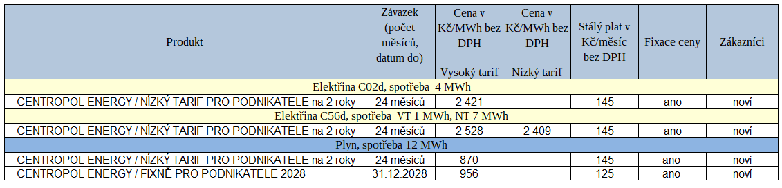 CENTROPOL ENERGY se snaží nově oslovit podnikatele s nízkou spotřebou elektřiny a plynu s fixní cenou na dva roky. Produkt Nízký tarif pro podnikatele je určen pro nové zákazníky s roční spotřebou do 8 MWh elektřiny nebo 15 MWh plynu. Ceny elektřiny i plynu patří mezi nejvýhodnější na trhu. Bohužel obchodník již není tak vstřícný k zákazníkům, co se týká výše stálého platu, který dosahuje částky 145 Kč/měsíc. Konkurence u plynu většinou nabízí nižší stálý plat u zákazníků s malou spotřebou.
