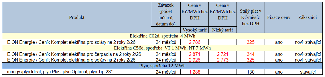 E.ON aktualizoval nabídky dodávek elektřiny pro soláry a pro tepelná čerpadla. Původní verze tarifů byla z července 2025 a tyto ceníky byly posledními, které neprošly aktualizací. Ostatní ceníky již obsahovaly obchodní ceny na rok 2026. Nově lze sjednat produkt pro soláry „Ceník Komplet elektřiny pro soláry 2/26“, u kterého velmi mírně vzrostla cena silové elektřiny o 9 korun za megawatthodinu, ale stálý plat je vyšší o 41 Kč a stoupl na 325 Kč/měsíc.