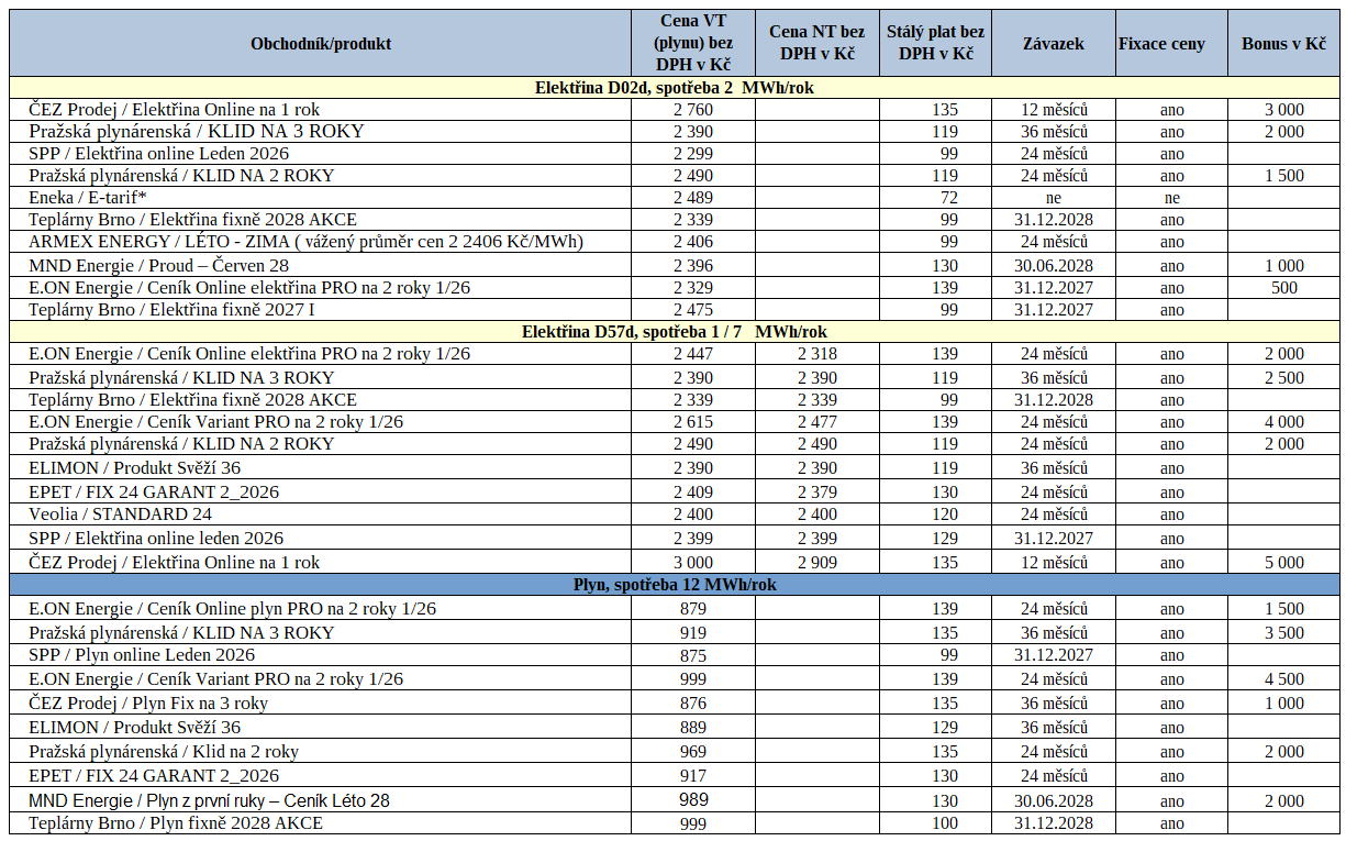 Následující tabulku mohou čtenáři využít jako informaci o oficiálních nabídkách dodavatelů s tím nejlepším, co nabízejí. Lze ji také využít pro získání přehledu o cenách k cenovému vyjednávání za účelem snížení ceny zákazníka pro další období, když zákazník chce zůstat u stávajícího dodavatele, protože je jinak s jeho službami spokojen. V uvedené tabulce nejsou všechny cenově výhodné nabídky, obsahuje jen ty, které bych si vybral, pokud bych se musel rozhodovat o dodávkách. Tabulka má omezenou platnost do dalšího článku, protože nemohu zaručit úpravu nabídky vybraných dodavatelů.