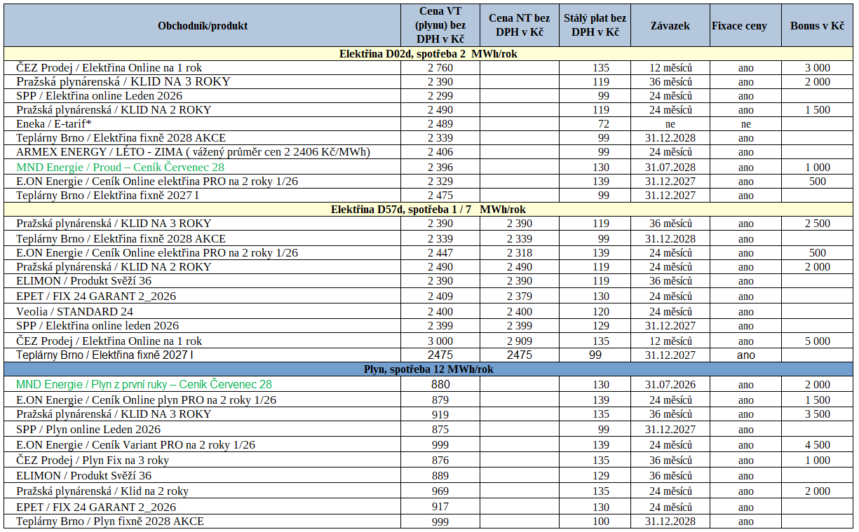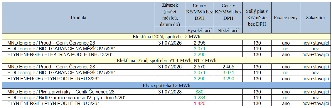 Tab. 1: Nové ceníky za uplynulý týden (červeně – růst ceny, zeleně – pokles ceny, * měsíční fix)
