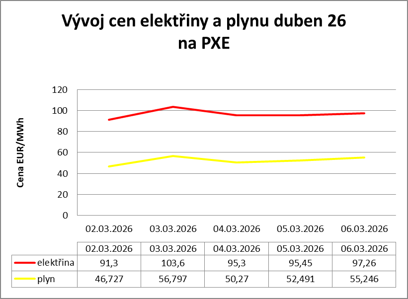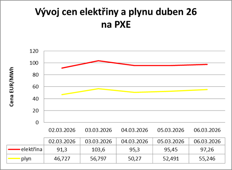 Kvůli válce v Íránu začaly silně růst ceny plynu a i elektřiny na burzách v ČR. V následujícím grafu je vývoj cen na burze PXE v měsíčním kontraktu na duben v jednotlivých dnech.