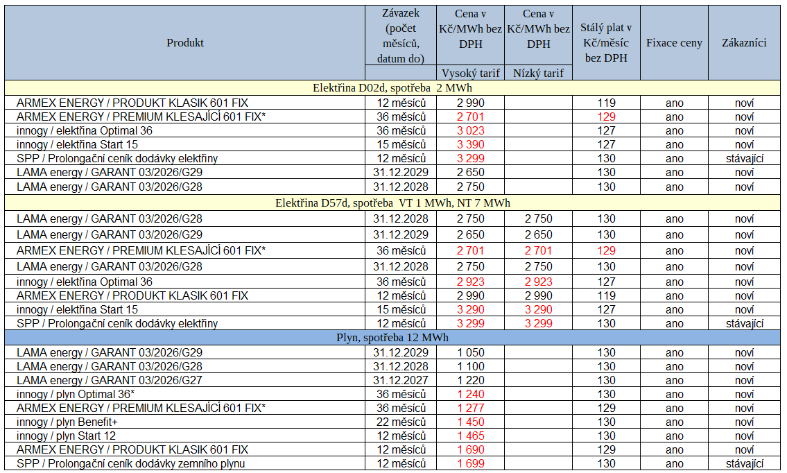 Tab. 1: Nové ceníky (červeně – zvýšení ceny, pokud tarif lze porovnat, * – vážený průměr cen u tarifů s klesající cenou)