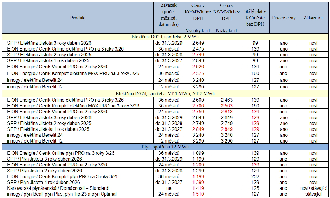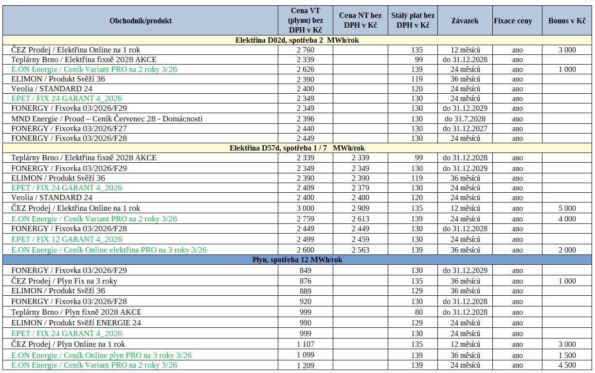 Již dlouho se tato tabulka tak nezelenala jako nyní. Je to tím, že dodavatelé zveřejňovali nové ceníky a ty nejvýhodnější byly propsány do tabulky. Z nabídek platných ještě několik týdnů zpátky téměř nic nezbylo, ceny energií jsou již nyní vyšší, před čímž jsme varovali. Přehled má omezenou platnost pouze do vydání příštího článku, uvedené nabídky je potřeba ještě ověřit u dodavatele z důvodu častých změn.