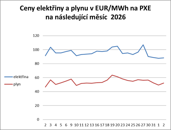 Následující graf ukazuje vývoj cen plynu a elektřiny od začátku války v Íránu. Jedná se o ceny kontraktu na následující měsíc na burze PXE.