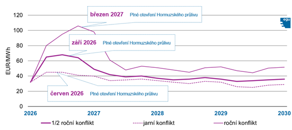 V závislosti na délce uzavření Hormuzského průlivu odhaduje EGU různé cenové trajektorie. V případě optimistického dvou až tříměsíčního výpadku by průměrná cena pro rok 2026 činila přibližně 41 EUR/MWh s návratem k normálu již v roce 2027. Pokud by však blokáda trvala do podzimu, průměrná cena roku 2026 by vzrostla na 57 EUR/MWh a pod hranici 40 EUR/MWh by se trh vrátil až v roce 2028. Nejhorší, scénář roční uzavírky pak předpokládá průměrnou cenu pro rok 2026 ve výši 78 EUR/MWh (s krátkodobými špičkami nad 100 EUR) a přetrvávající vysoké hladiny i v dalších letech, což je způsobeno trvalým poškozením části katarské infrastruktury a přetrvávajícím bezpečnostním rizikem.