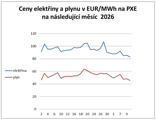 Podívejme se ještě na průběh cen elektřiny a plynu od začátku íránské krize. V grafu jsou uvedeny ceny elektřiny a plynu na burze PXE u kontraktů na následující měsíc. V současné době jsou ceny podobné jako na začátku krize.