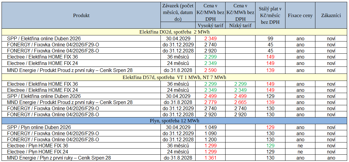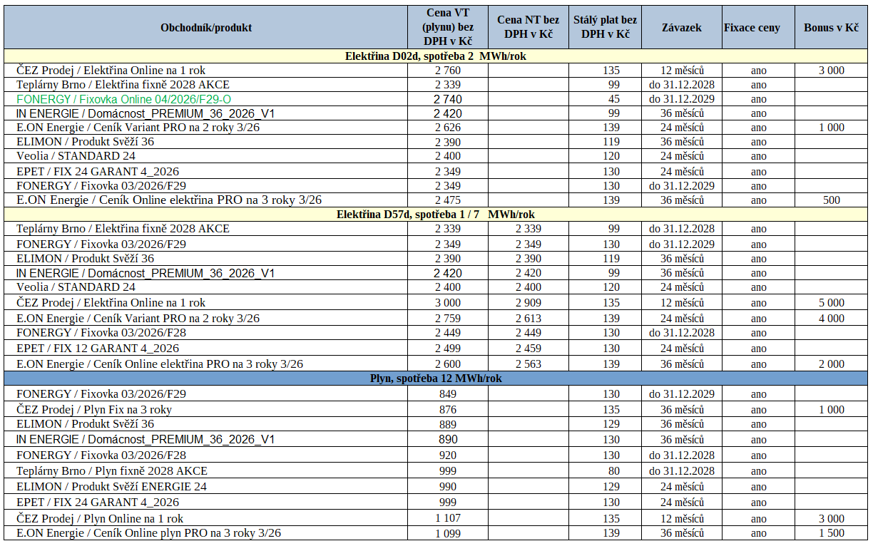 Sice ceny za dodávky energií pomalu rostou, ale přesto si lze stále vybrat výhodnou nabídku a ušetřit tak, proti minulým rokům. Situace ve světě je ale nejistá, tyto výhodné nabídky nemusí trvat věčně. V následující tabulce jsou výhodné nabídky, které je ale potřeba si ověřit, protože je dodavatelé nyní velmi rychle mění. Toto doporučení je platné pouze do vydání nového článku s aktualizovanou nabídkou. Ještě prosím zvažte, zda se vyplatí cenově nižší produkt s kratší fixací nebo o něco dražší s fixací na delší dobu.