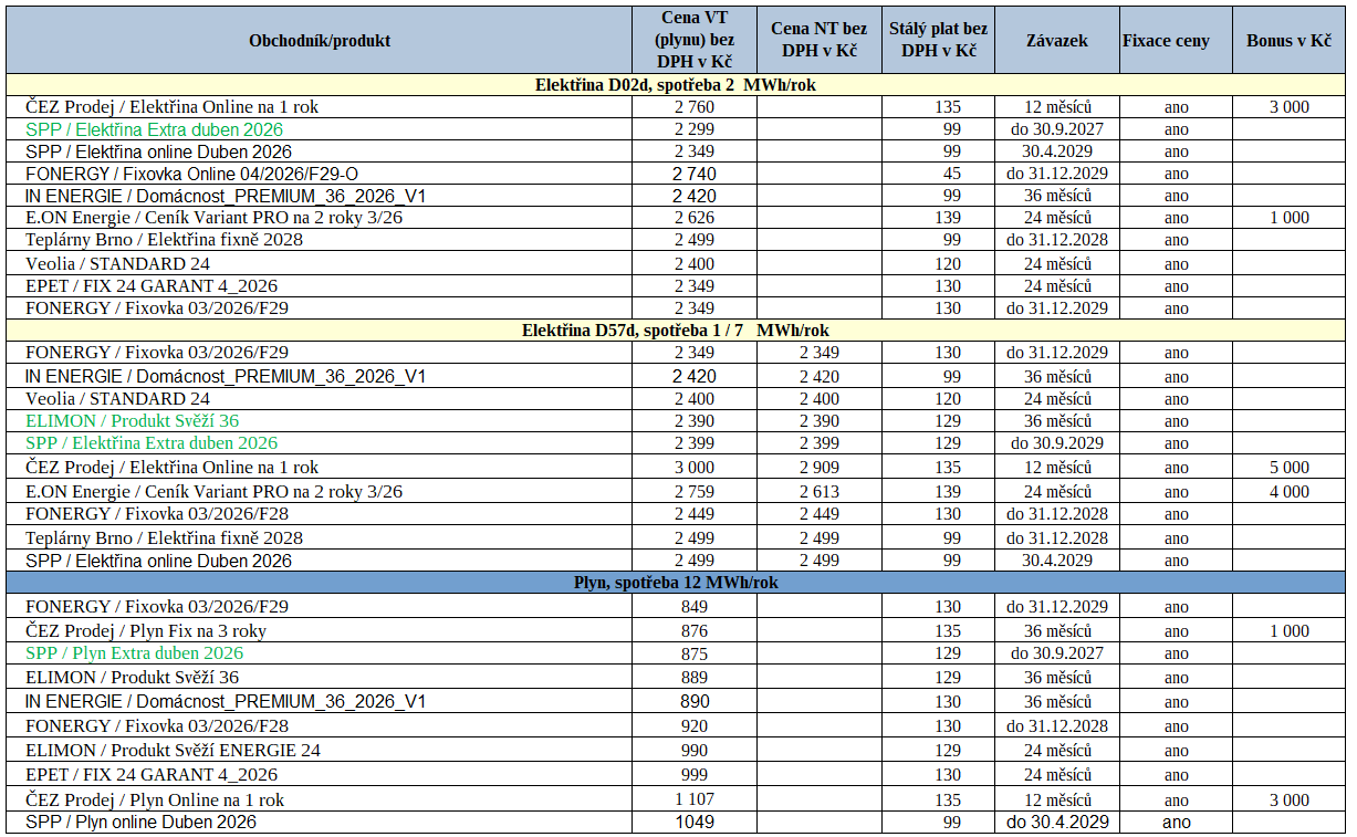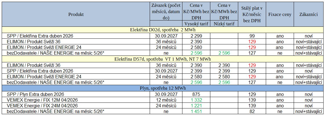 Tab. 2: Nové nabídky dodavatelů za uplynulý týden (zeleně – levnější ceny než v předchozí verzi, * – měsíční fix)