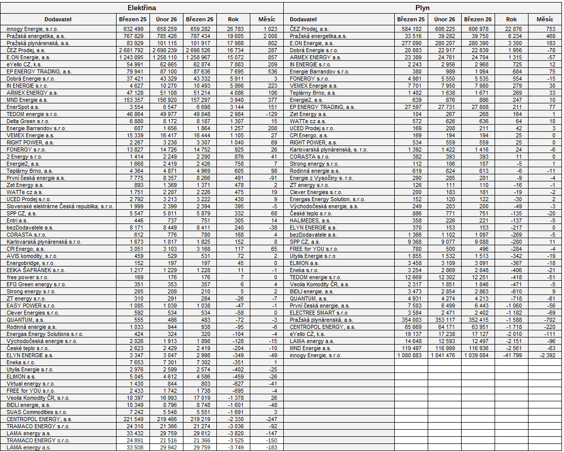 Operátor zveřejňuje počty odběrných míst dodavatelů, kteří mají více než sto odběrných míst. Data upravuji tak, aby v tabulce byli uvedeni pouze známí obchodníci z Kalkulátoru cen energií TZB-info. Vyřazuji dodavatele z lokálních distribučních sítí, podnikové sítě nebo společnosti, které dodávají jen podnikům. Pořadí je sestaveno od nejvyššího počtu získaných odběrných míst mezi březnem 2025 a březnem 2026.