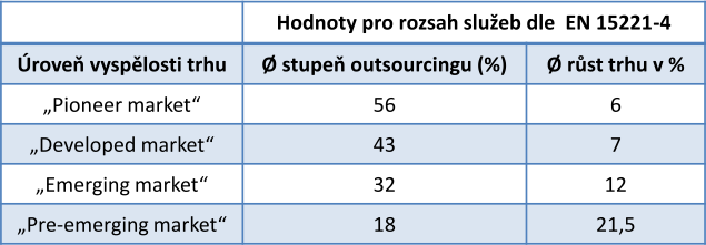 Základním kritériem dělení trhu dle výzkumu EuroFM Market Data je stupeň outsourcingu a podíl růstu trhu (viz tab. č. 1).